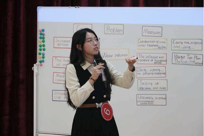 选手谷雨桐使用架构清晰的思维导图层层递进地分析导致水污染的原因,并组织员工开展小组合作讨论可行的解决方案。她通过比较市长、董事长、“河长”等不同主体,最终得出“人人都有责任保护水源”的结论。最后,她以多媒体赋能教学,通过播放相关视频来增强课堂教学的感染力,让员工深刻地认识到保护水资源的重要性。