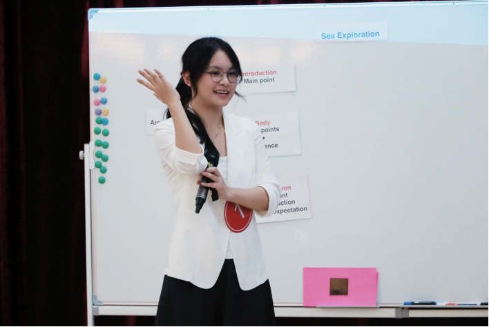 选手谭雯希以汉堡结构为喻,引出对文章结构分层的介绍。她通过小组讨论、互动问答等教学设计鼓励员工自主独立思考,教会员工通过寻找文章关键词、关键句来区分各类论据。同时,为了培养员工的辩证思维,她组织员工进行一个小型辩论来探讨“海洋是否应当被开发”的主题,并将习近平总书记的重要讲话精神融入课堂设计,分别阐明了进一步探索和开发海洋的利与弊。
