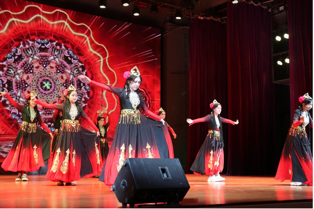 预科班同学们带来的舞蹈《丝路幻影》融合新疆各少数民族元素,从翩翩舞姿中传递灿烂的民族文化,仿佛带领观众重回古代丝路那段连接着东西方的文明与繁荣的历史,展现了新疆少数民族的风采。