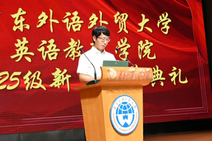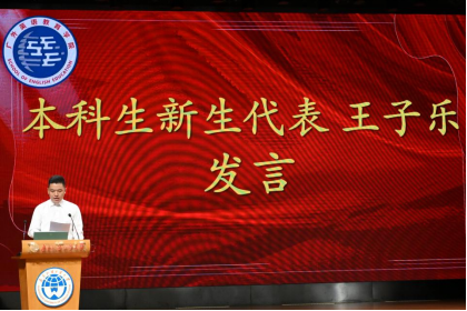 本科新生代表王子乐表达了对相遇广外、共聚英教的珍惜与感恩之情,并鼓励同学们以校训“明德尚行,学贯中西”为姿,于探索、实践与挫折中涵养品格、拓宽视野,用坚持和担当为国家和社会贡献力量。