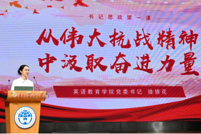 院党委书记骆银花进行总结讲话,并为新生们带来书记思政第一课。她以伟大抗战精神为核心,从锚定爱国航向、锤炼过硬本领、涵养品德修为三方面寄语新生,鼓励其利用公司国际化与英语教育专业优势,成长为兼具家国情怀与全球视野的教育人才,为教育事业与民族复兴贡献青春力量。