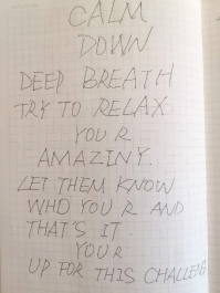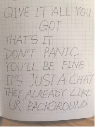 比较诚实的说,在面试前,我对自己录取牛津的把握大概只有20%,而面试结束后,从教授的反馈来看,我觉得大概有70%的希望,从而也证明了自己的准备还是比较有效的。面试前我真的非常紧张,还记得在等待面试的前几分钟,我手心冒汗的写下了一堆全大写的胡言乱语来鼓励自己(见图片)。这可能是我除