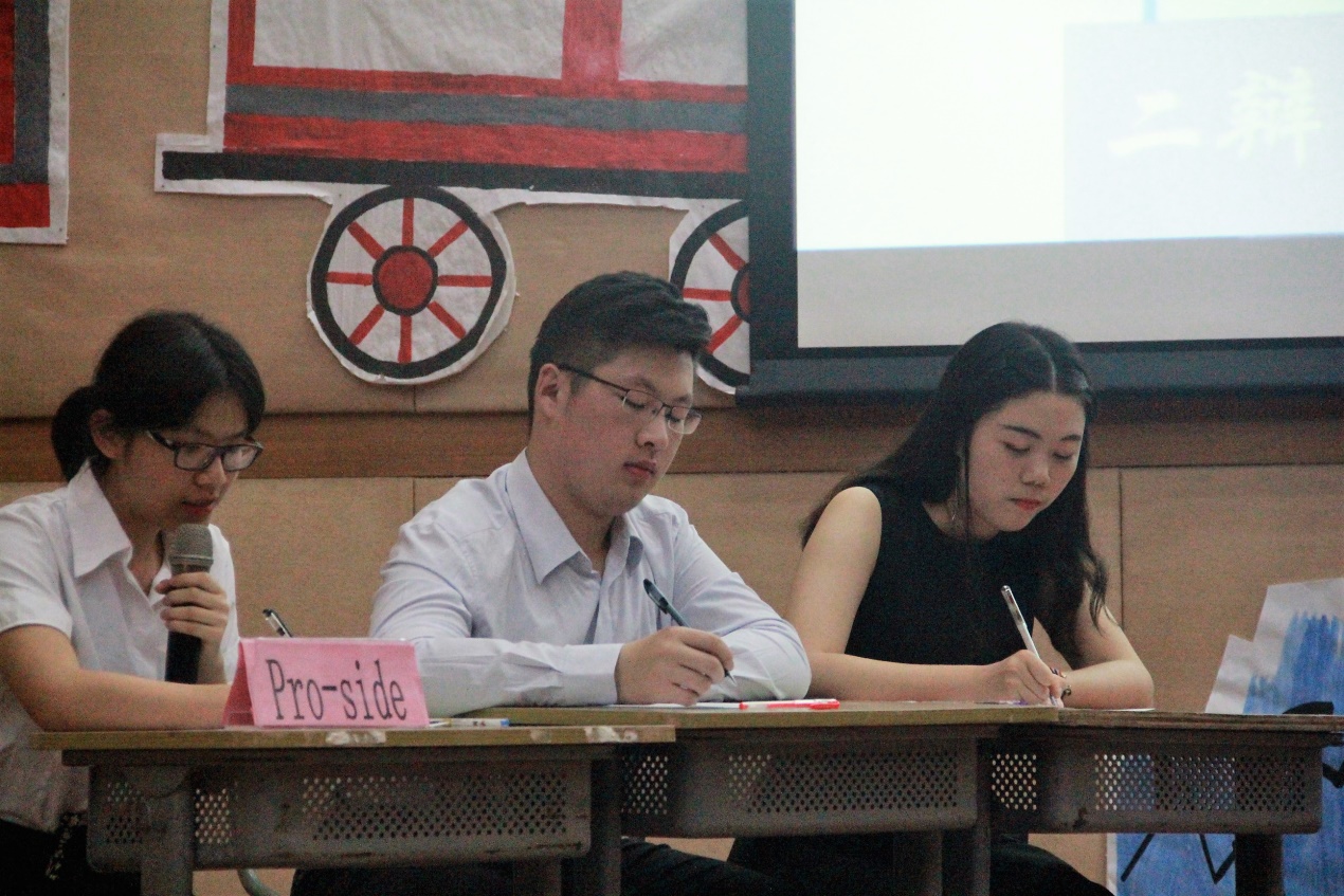 接着比赛进入第二轮,辩论双方需要按照给出的辩题进行辩论。比赛过程中,每个小组都对自己的那一方阐述了自己的观点,并给予对手有力的还击,充分展现出英教学子扎实和深厚的英语功底。Trinity队在反驳“Itis better to enjoy money currently than to save it for thefuture.”的时候,其队员将“save money”定义为节省和保留钱,来巧妙地反驳对方的观点,同时他们的观点有理有据,以及使用了适当的辩论技巧,展现出他们队富有经验的辩论能力和自信的一面。他们强而有力的争辩,赢得了台下观众热烈的掌声。