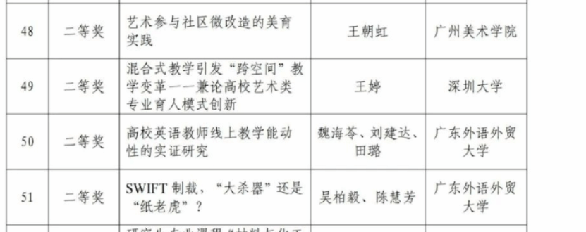 近日,2023年广东省学位与研究生教育学会优秀教学成果奖项目已经面向社会公示并完成,共有63项广东省学位与研究生教育学会优秀教学成果获奖。公司魏海苓教授作为第一成果完成人的《高校英语教师线上教学能动性的实证研究》荣获广东省学位与研究生教育学会优秀教学成果奖二等奖。